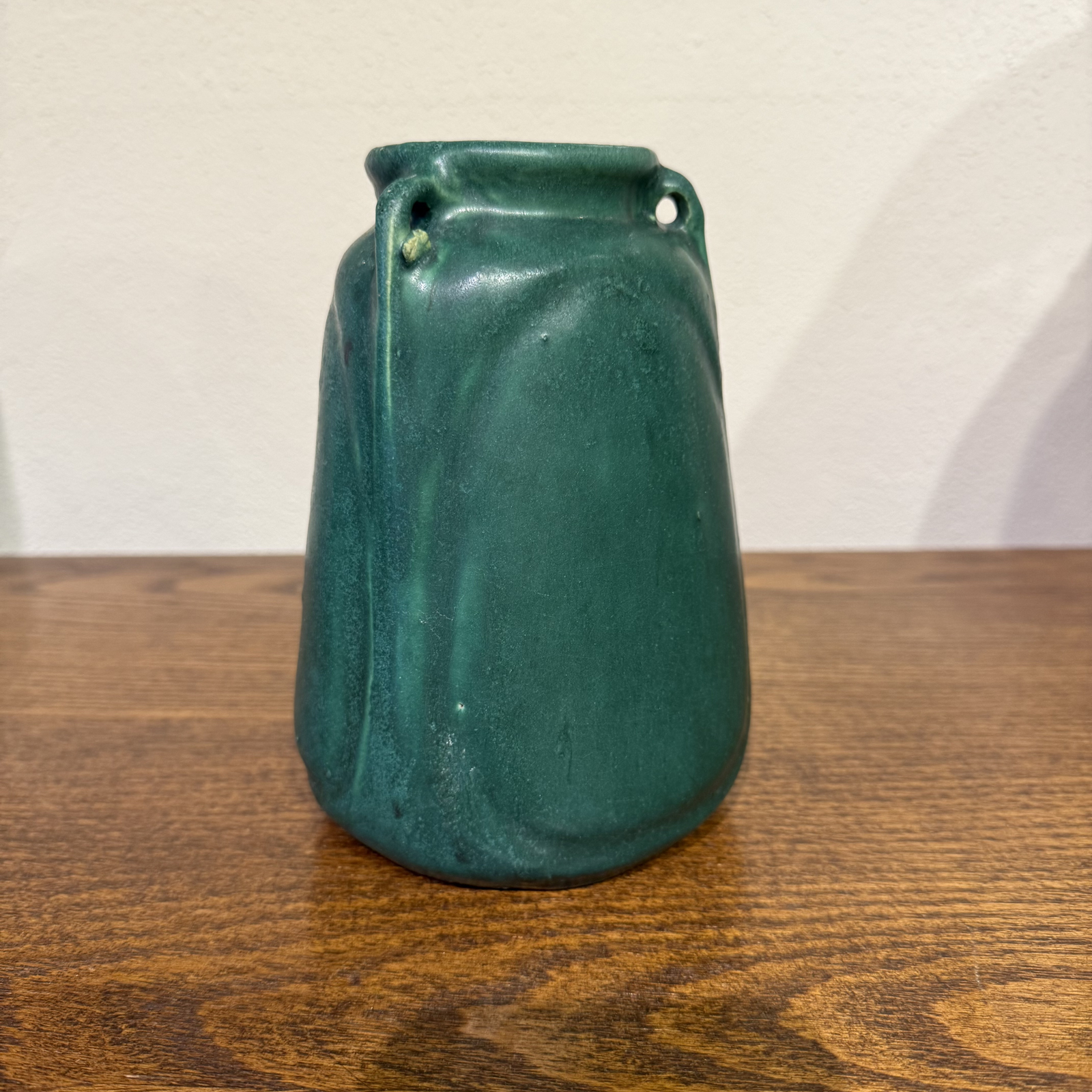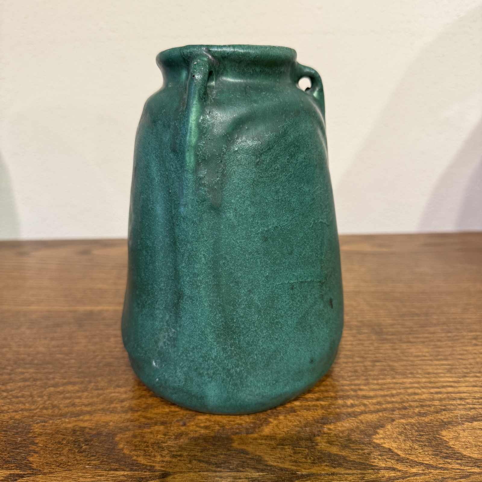Standing 6 7/8″ tall and covered in a rich green glaze, this piece shows strong evidence of being largely hand made, as seen in the subtle variations of the finish and glaze application.