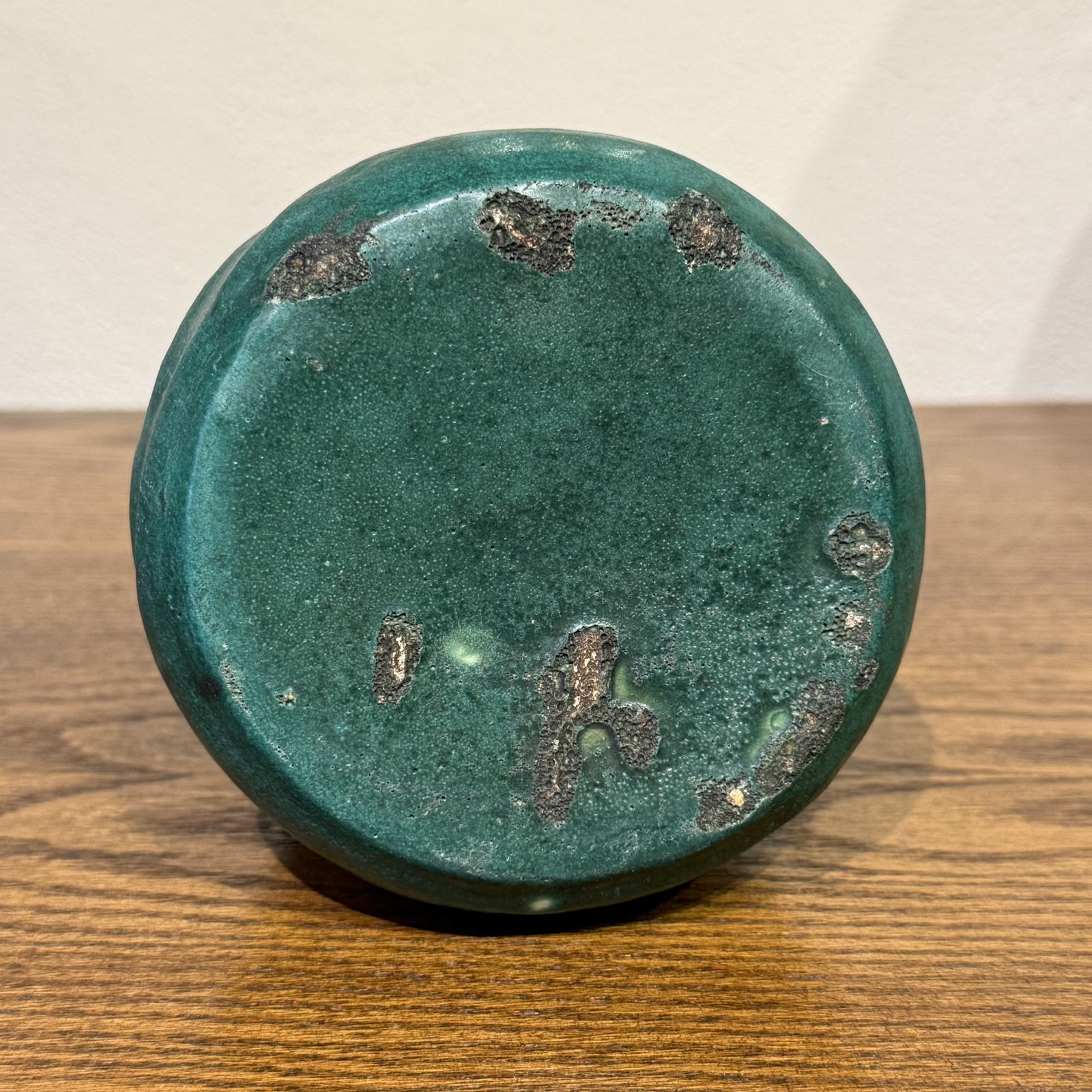 This rare green stoneware vase was originally produced as a lamp base, though the form was also offered as a standalone vase. During production, the factory drilled an opening near the base prior to glazing — a detail consistent with other examples known to have been adapted for lighting.