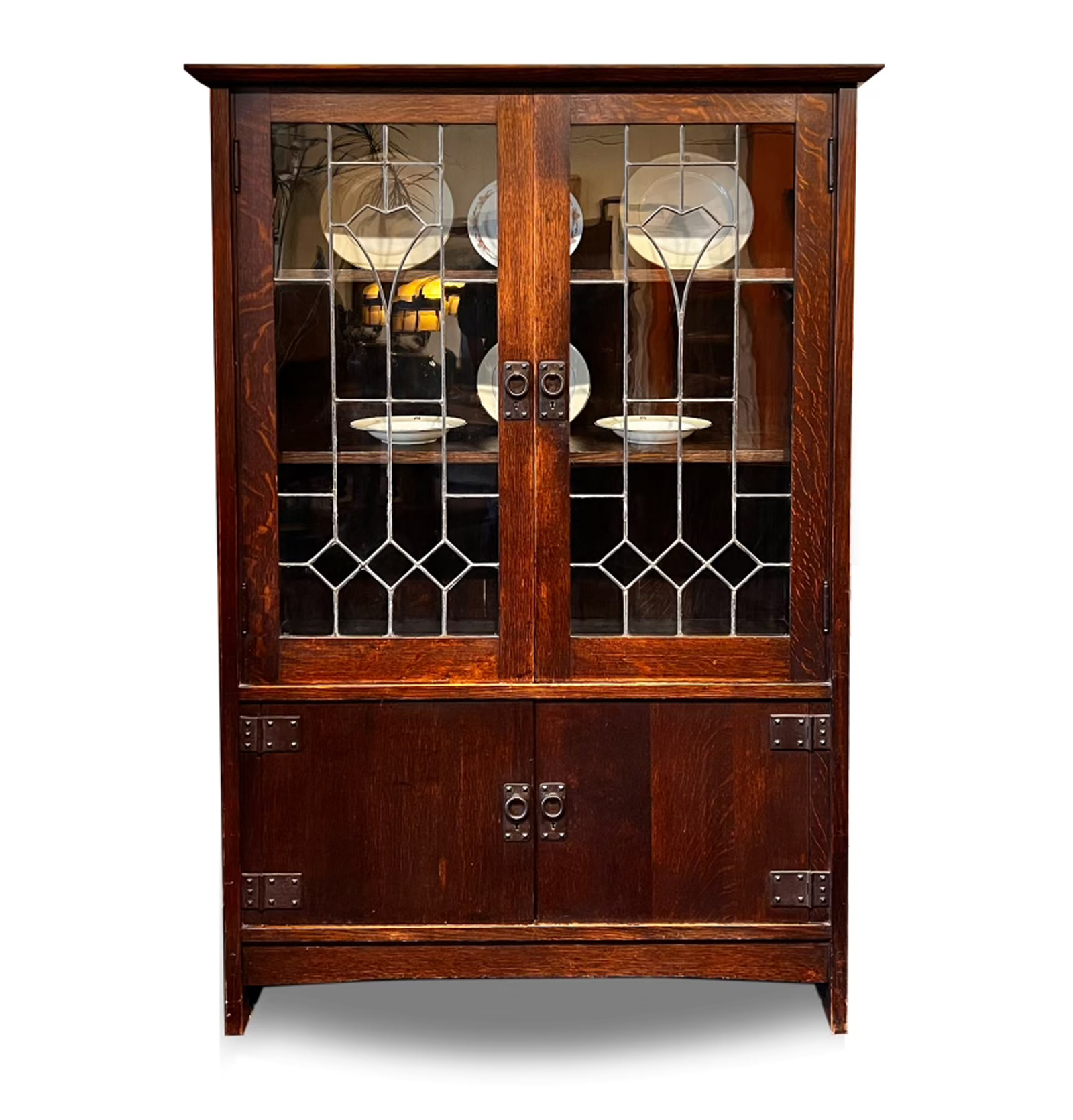 Rich quarter-sawn oak with a warm, original finish in superb condition and measuring 68 1/2″ x 44 1/2″ x 17 1/4″ deep. The leaded glass is all original as well as all the leading. lower storage cabinets with solid wood panels and original hardware