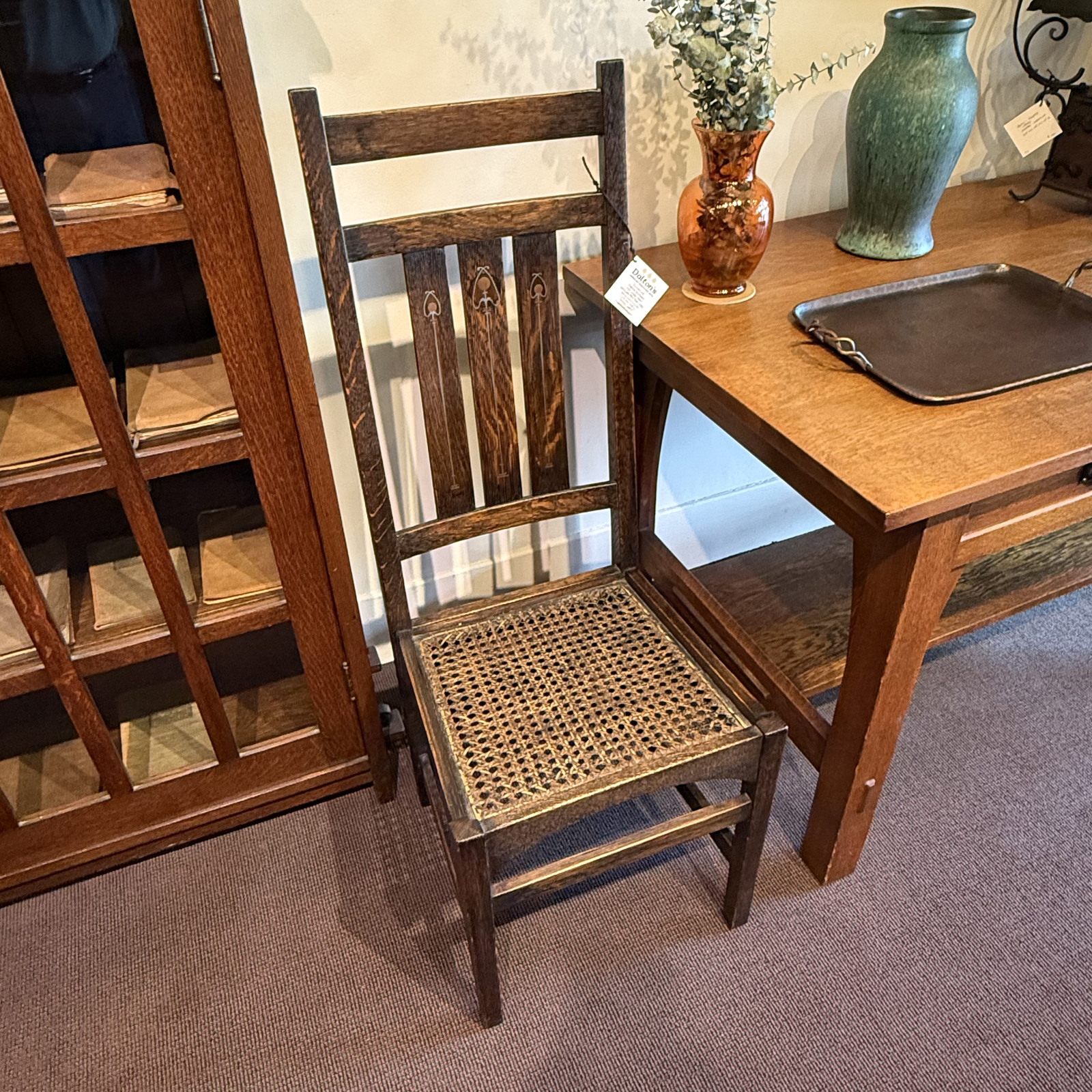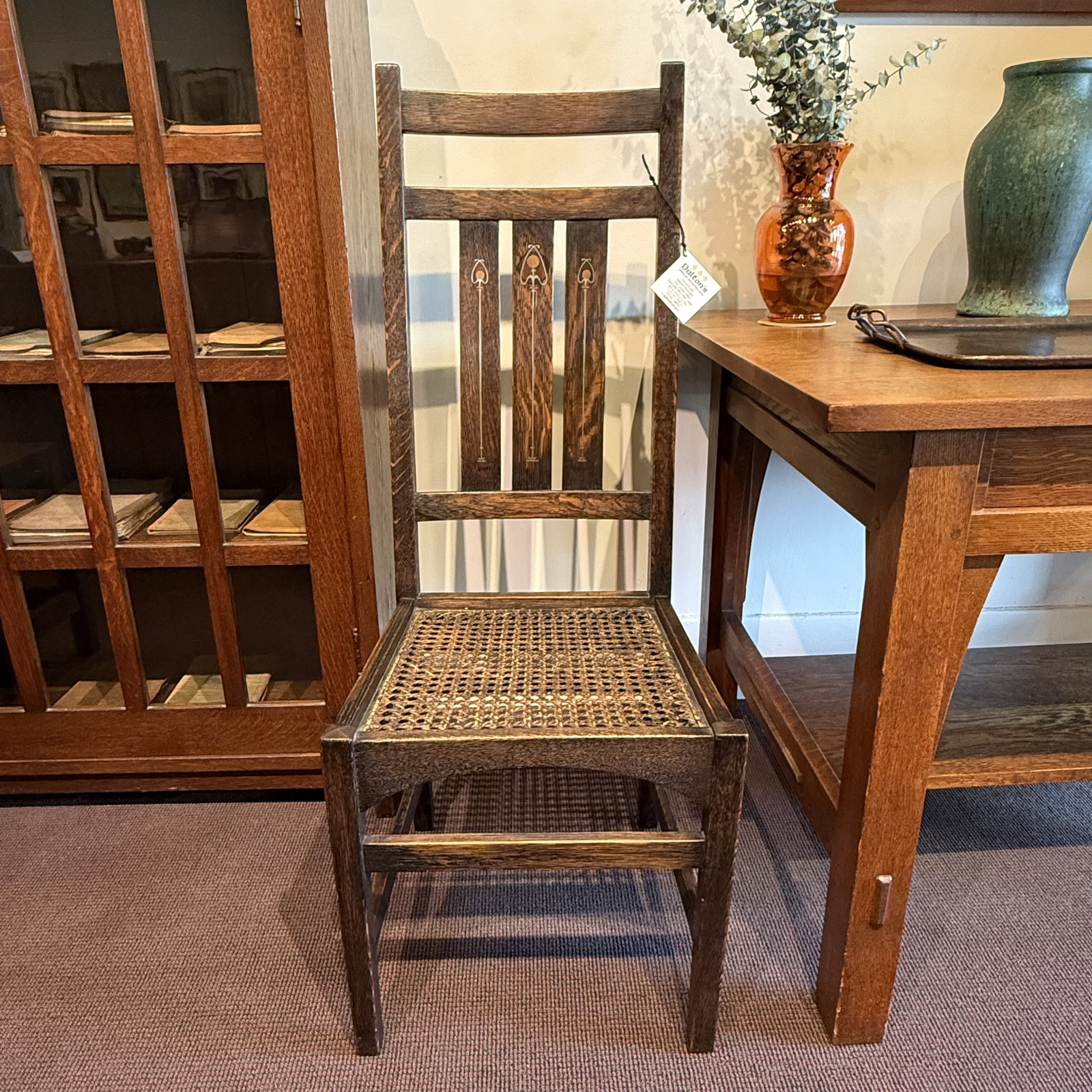 A rare and beautiful side chair attributed to the design work of Harvey Ellis during his brief but influential tenure with Gustav Stickley. This example, dating from 1902–1904, is marked with the appropriate early decal for the period. The chair features Ellis’s hallmark use of delicate inlay, adding refinement to Stickley’s strong Craftsman form.
