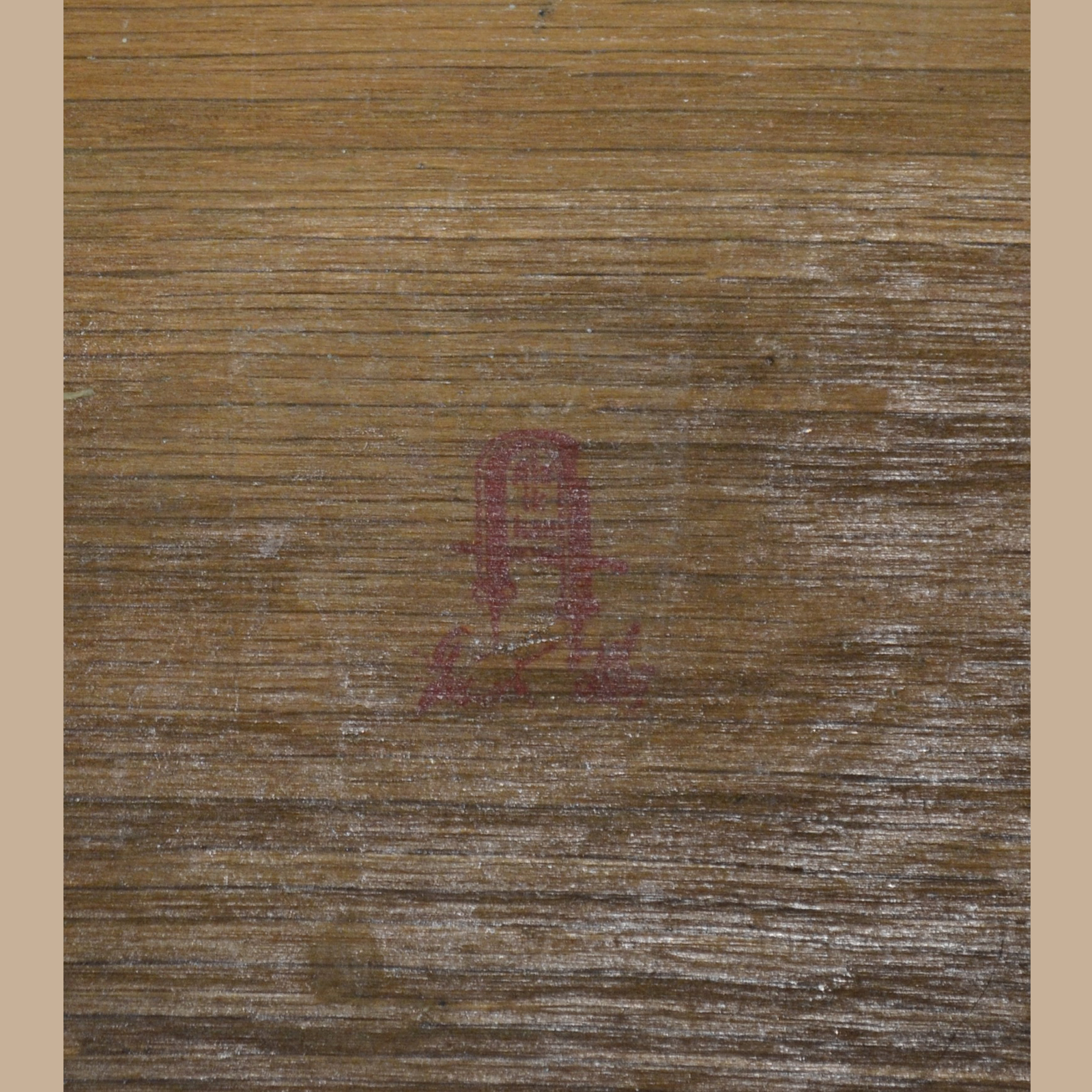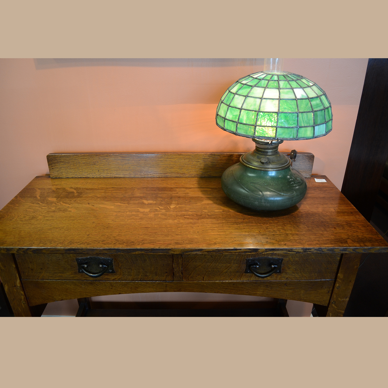 Gustav Stickley, Ellis inspired two drawer server, catalog #802. Very nice condition with an extremely thin overcoat. This measures 35 1/2″ tall, add 3 1/2″ for backsplash and is 42″ wide and 17 3/4″ deep. Signed with a red decal inside drawer.