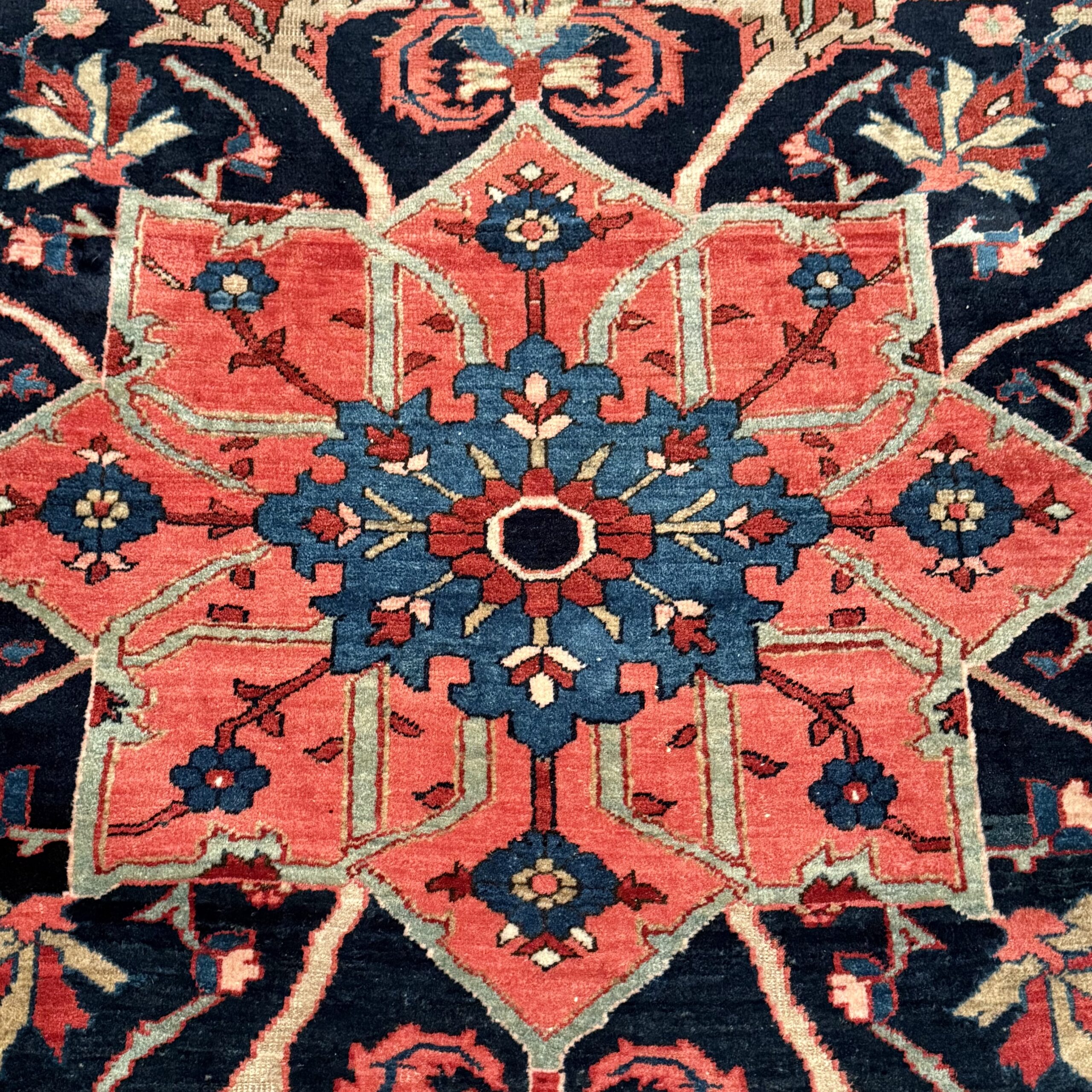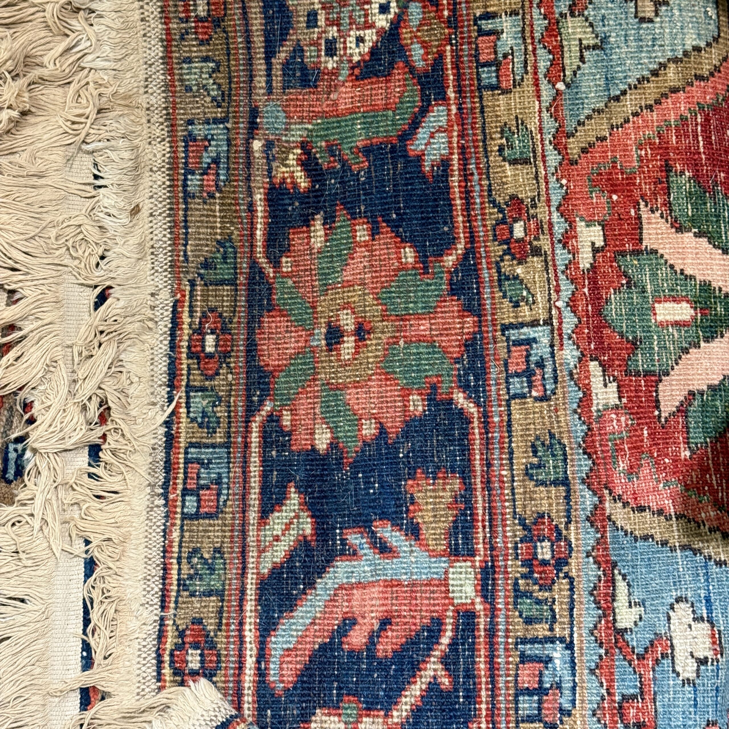 A handsome Heriz carpet, dating to around 1920, known for its bold geometric design and durable weave. Measuring 9’2″ x 11’2″, it offers a generous scale well-suited for a variety of interiors.
