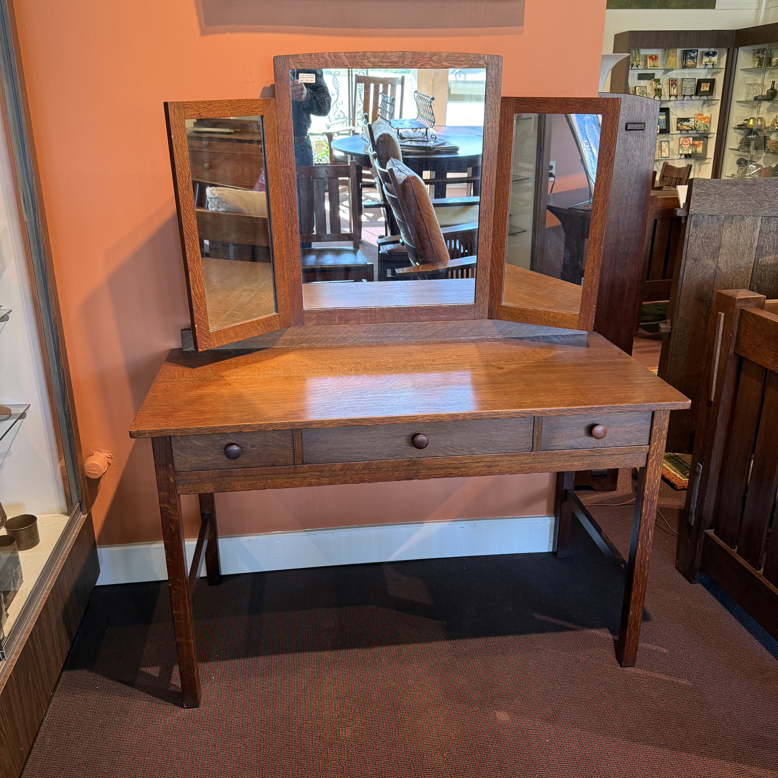 The dressing table retains “The Work of L&JG Stickley” decal. This is model #103 done in quarter sawn American White Oak with round wood pulls. Piece measures 59″ tall X 48″ wide x 22″ deep.