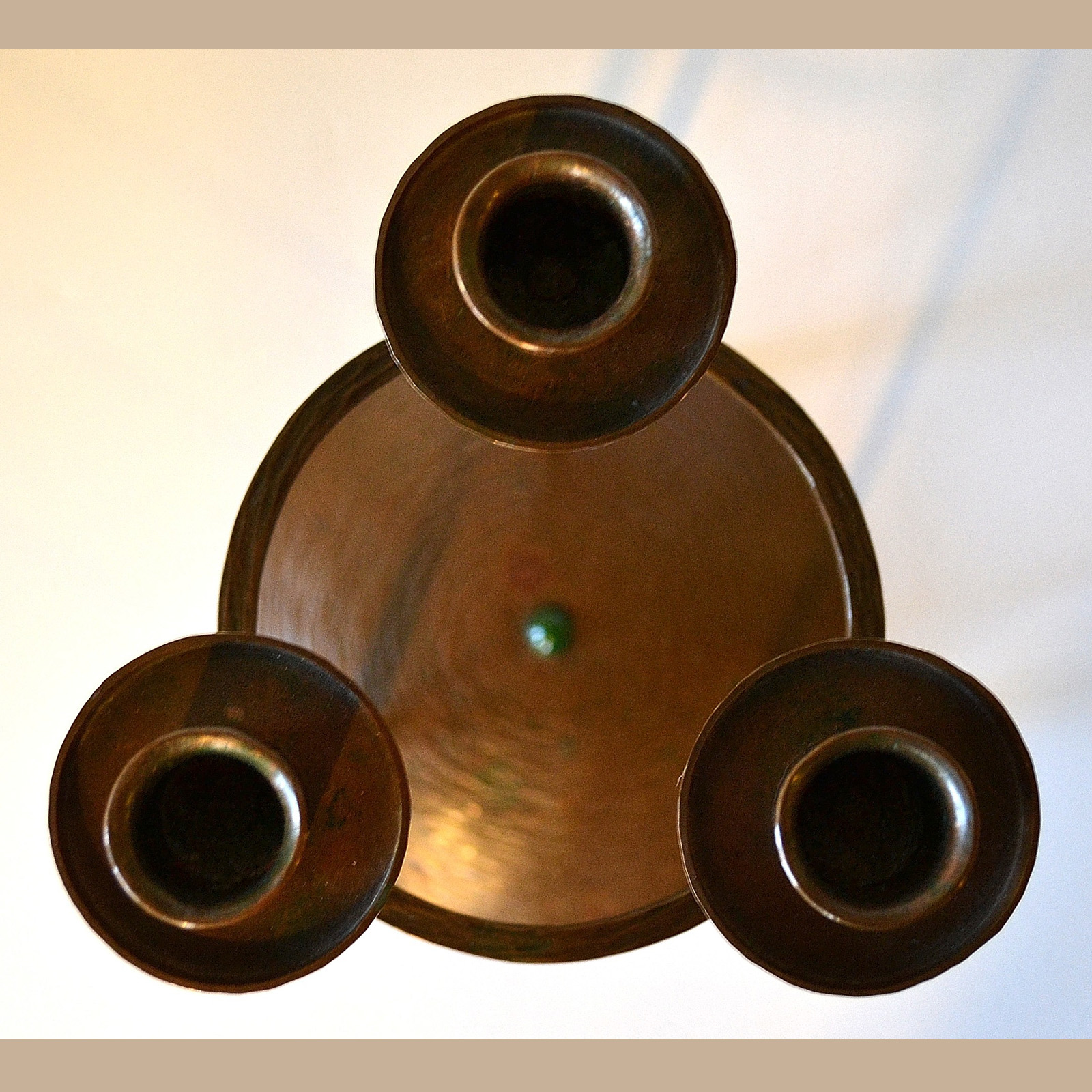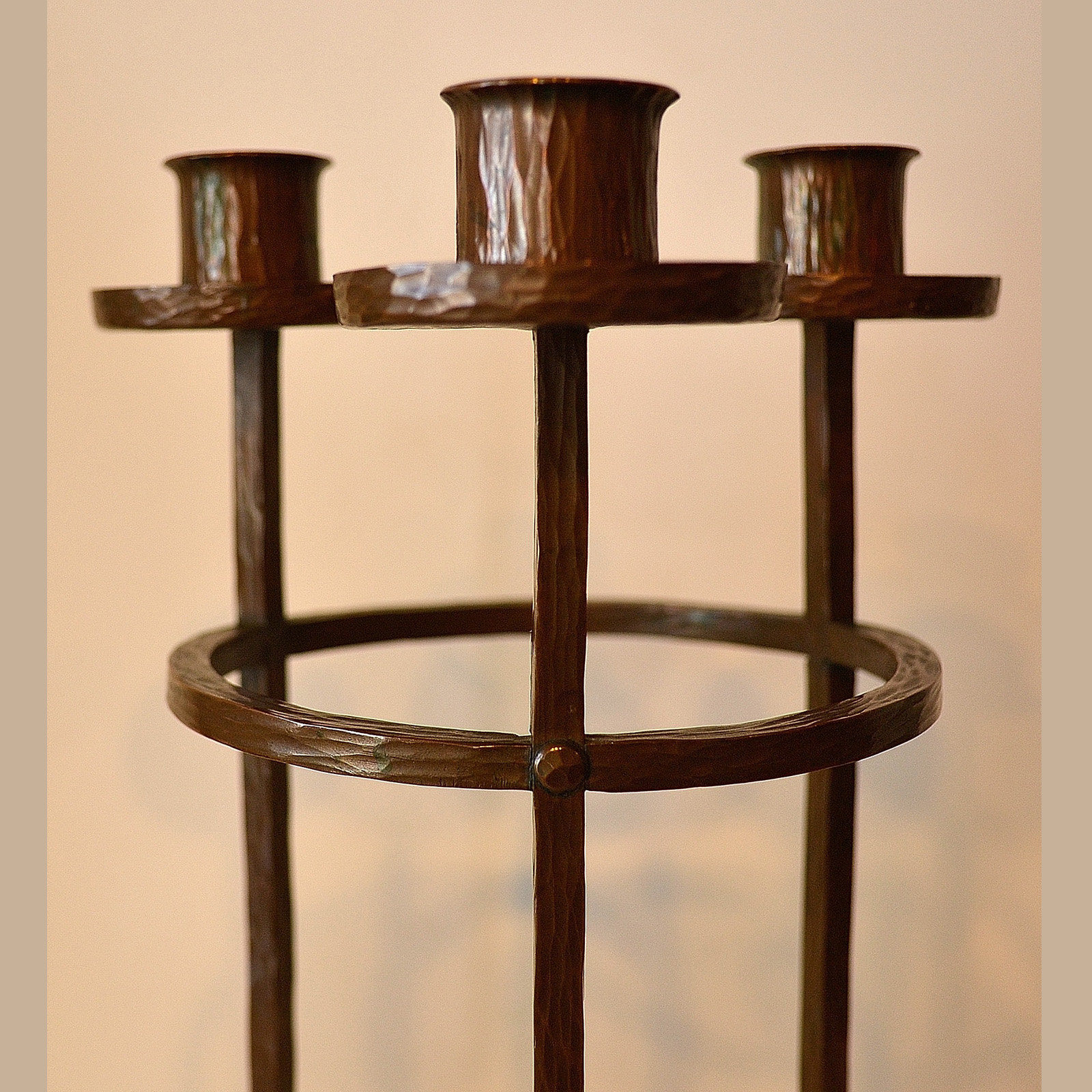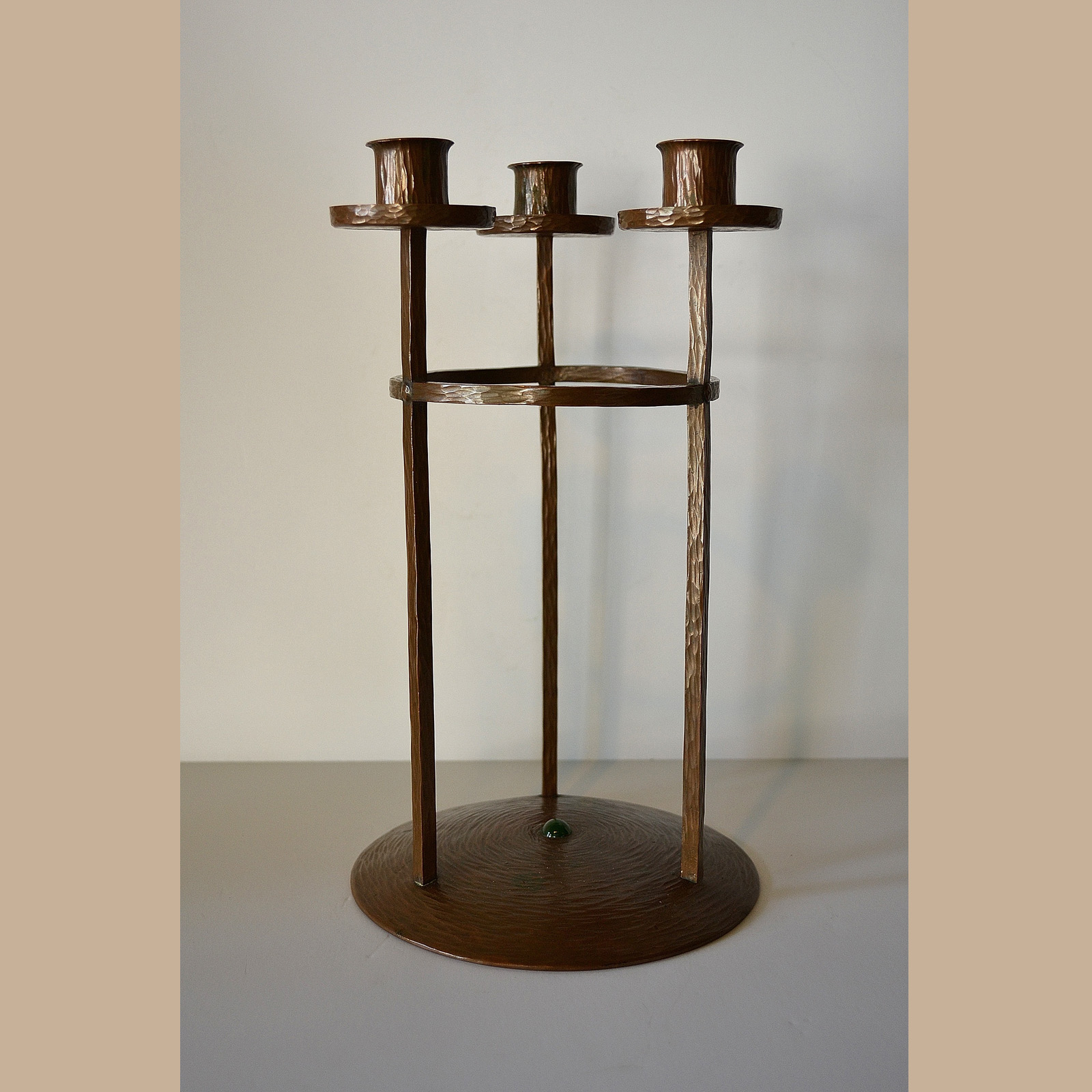 Rare and Important Roycroft Triple Candlestick. Measures 10 1/2 inches high and 6 inches wide. This circa 1911 design is attributed to Karl Kipp and shows the Viennese influence.