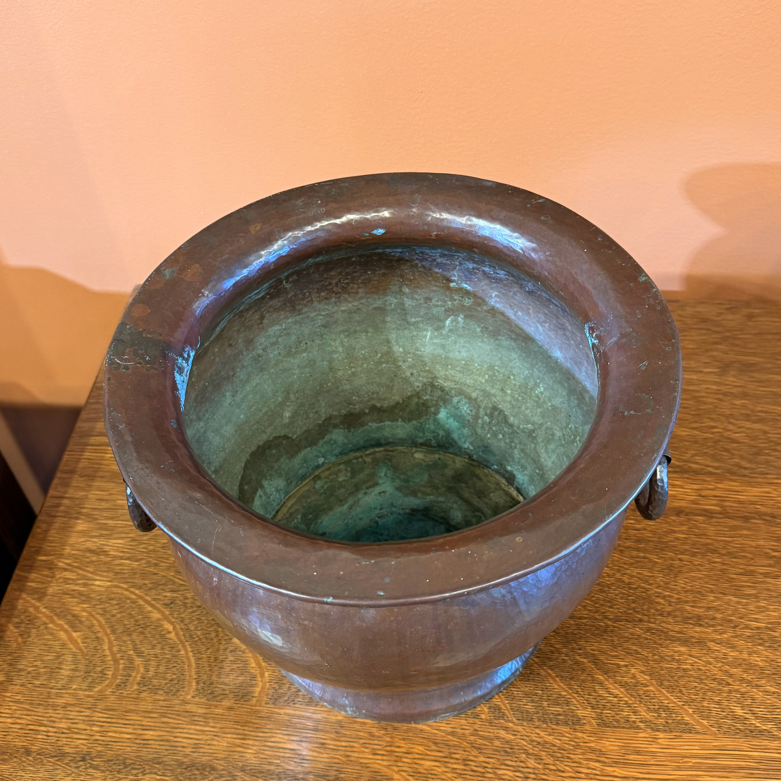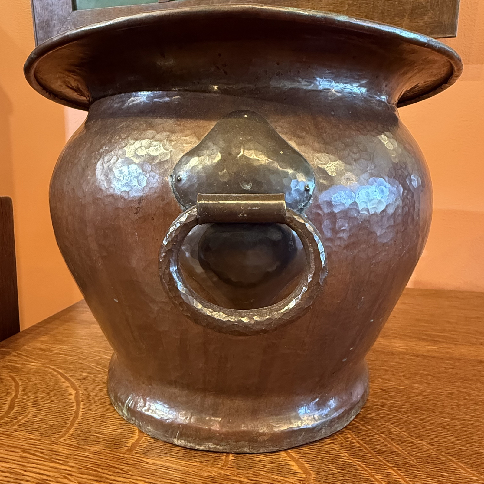This elegant Arts and Crafts jardinière was produced by The Turchin Co. Inc. of New York City during the first quarter of the 20th century. Measuring 8 1/2″ tall and 11″ in diameter, it showcases the firm’s refined craftsmanship and design sensibility. The piece retains its original patina in good condition, a testament to its quality and care over more than a century.